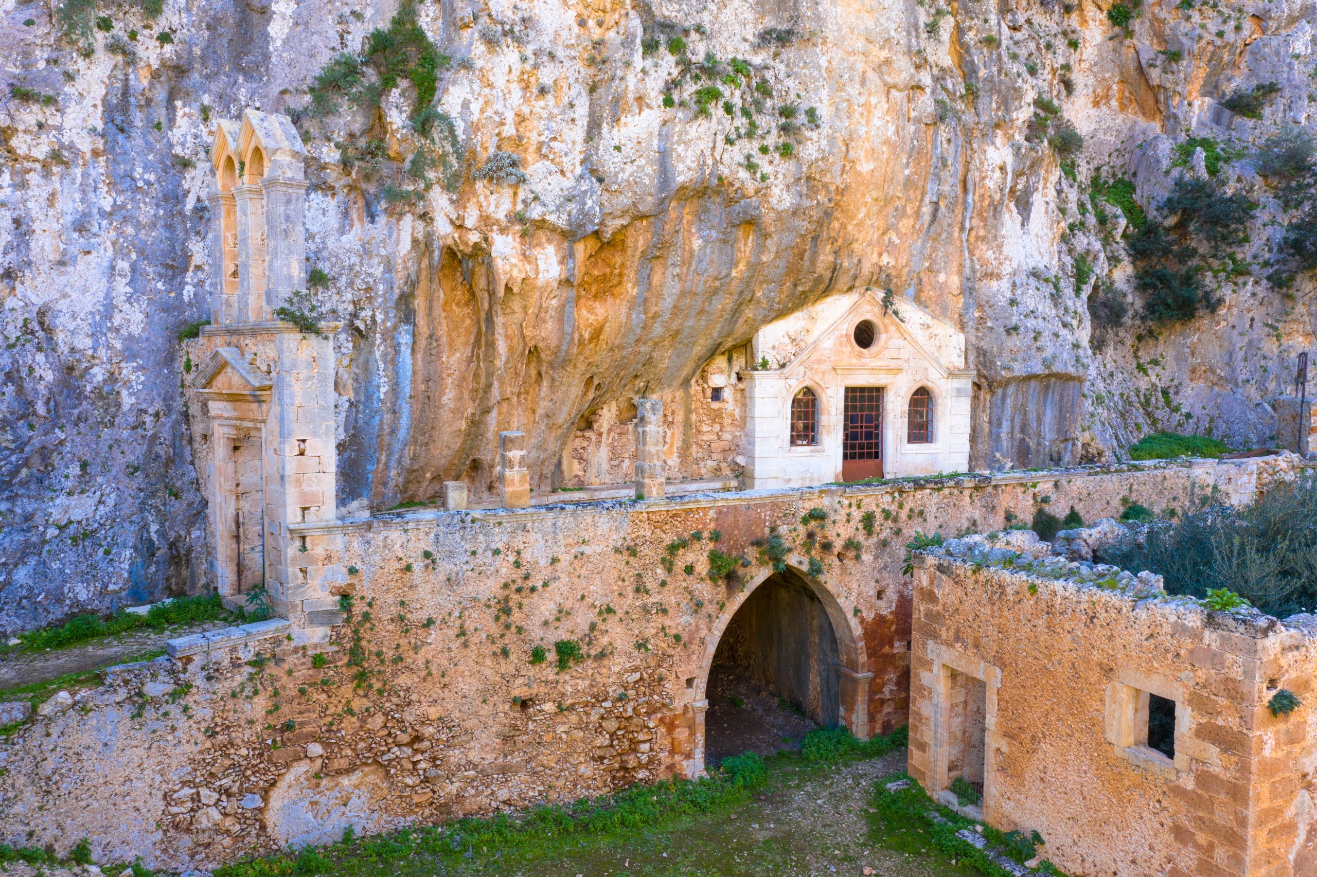 Anders als viele prachtvolle Klosteranlagen wirkt Katholiko beinahe unscheinbar – und gerade darin liegt seine Kraft. Die Kirche ist direkt in den Fels gebaut, Mauern und Steinwände verschmelzen mit der natürlichen Umgebung. Besonders eindrucksvoll ist der große Steinbogen, der sich über das trockene Flussbett spannt und wie ein Tor zwischen Vergangenheit und Gegenwart wirkt. Diese schlichte Architektur verstärkt die Wirkung des Ortes enorm.