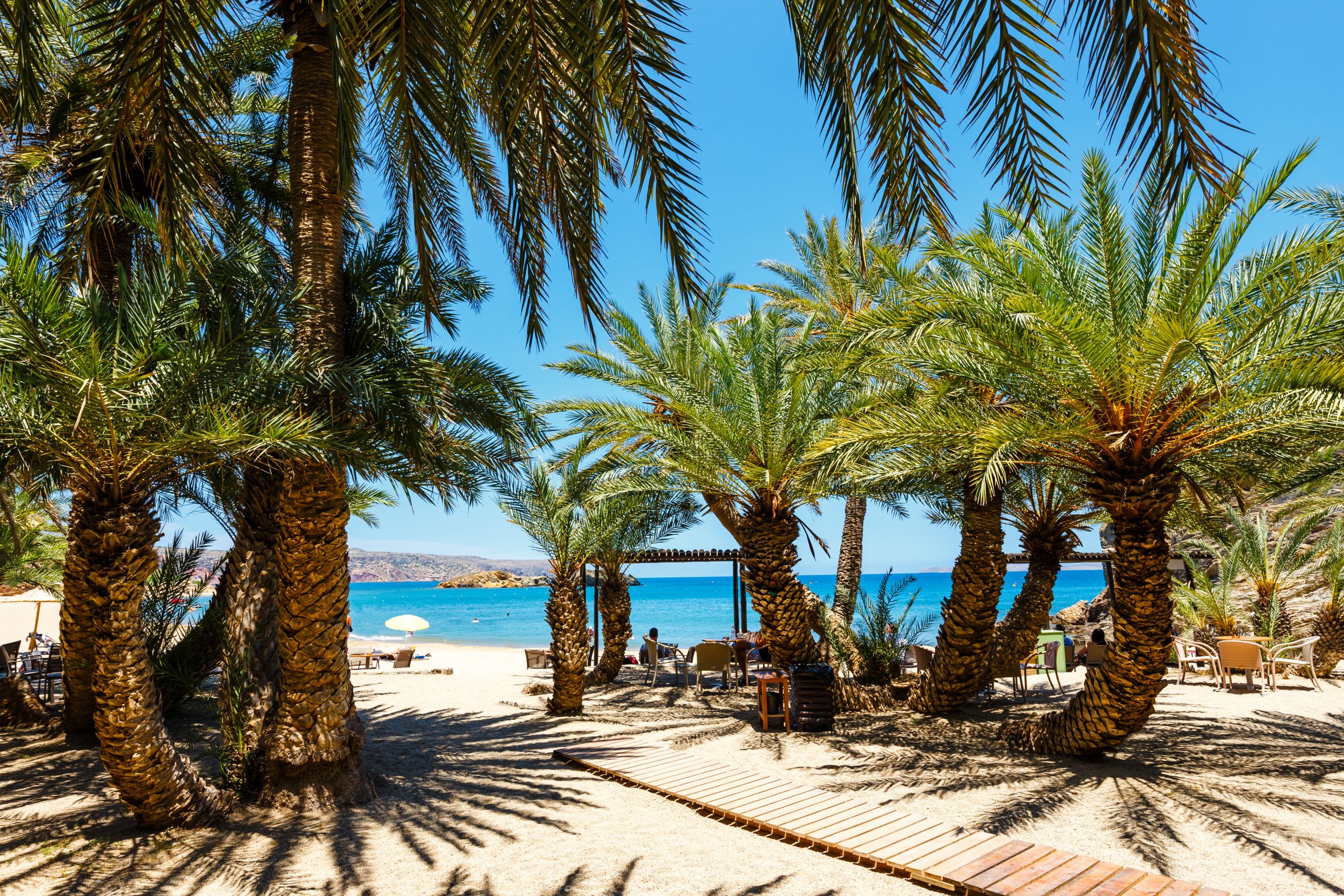 Wenn du aufmerksam durch den Palmenhain gehst, entdeckst du kleine Lichtungen, natürliche Sandpfade und immer wieder überraschende Ausblicke auf das Meer. Besonders schön ist der kurze Aufstieg zu einem Aussichtspunkt oberhalb der Bucht – von dort zeigt sich Vai in seiner ganzen Schönheit: eine geschwungene Küstenlinie, eingerahmt von Grün und dem endlosen Blau des Mittelmeers.